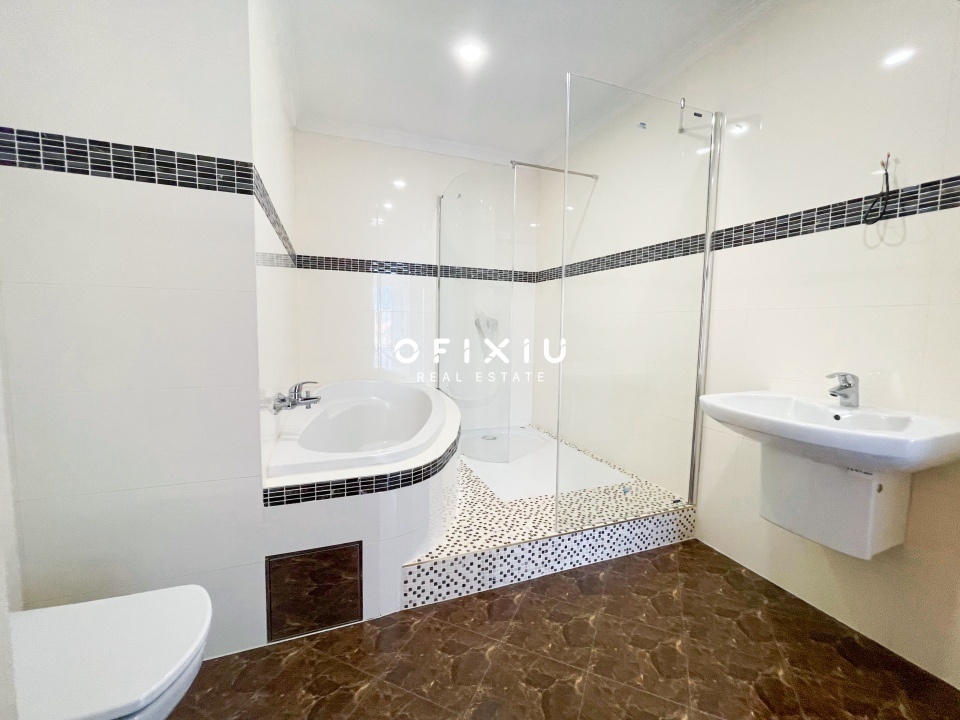 V prvním patře se nachází kuchyň, obývací pokoj, terasa, ložnice, koupelna s vanou a sprchovým koutem a toaleta. Kuchyňská linka je vybavena troubou, varnou deskou, myčkou a lednicí s mrazákem. Byt plně je vybaven nábytkem.