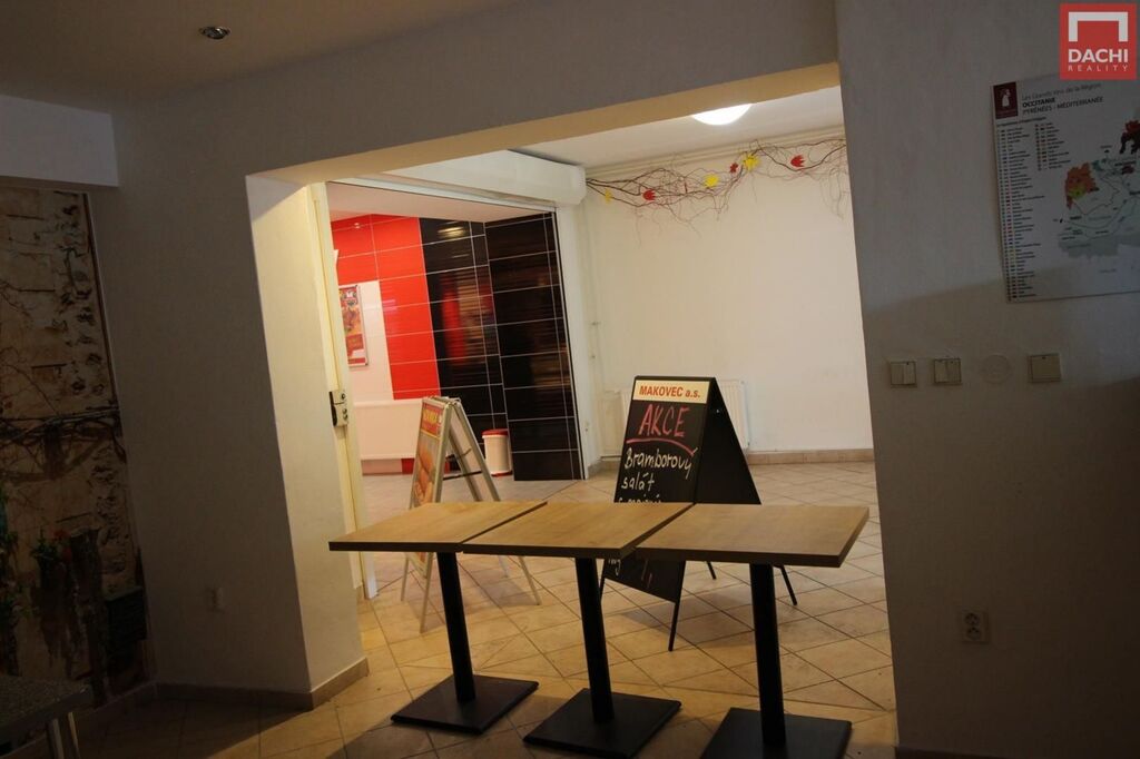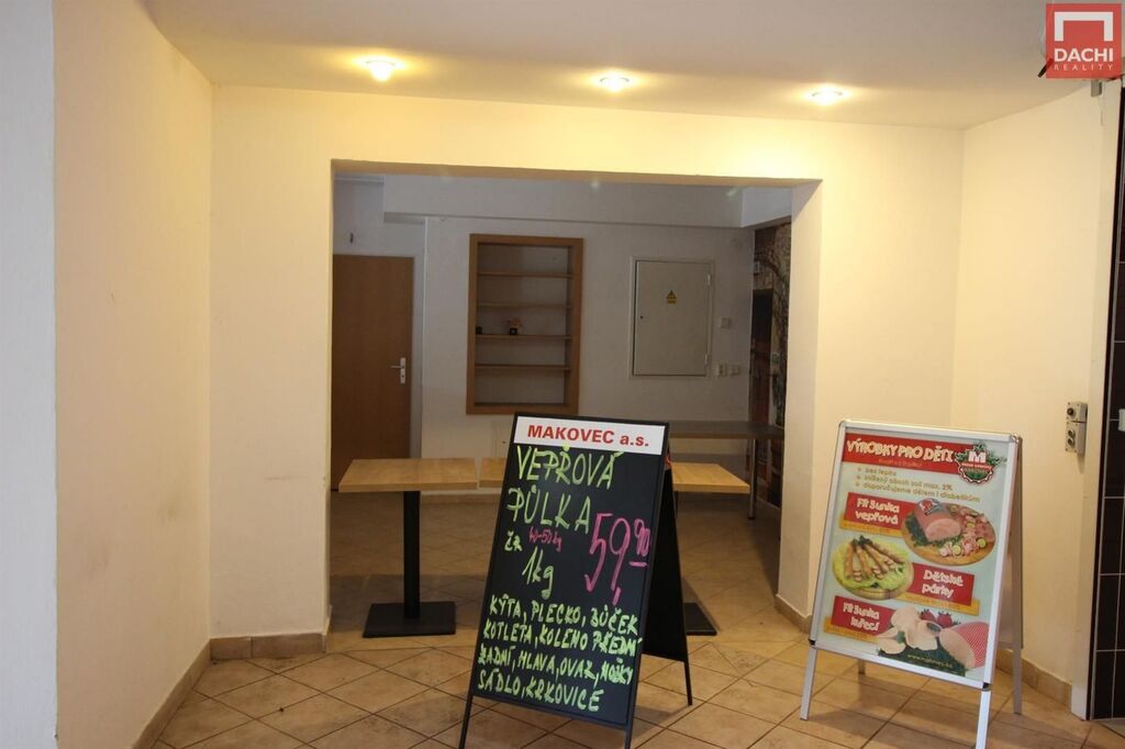 Jedná se o prostory s výlohou, podlahy dlažba, v prostoru je připojení na vodu a odpad. Jedná se o prostor na frekventované ulici. Vhodné na prodejnu ovoce, zeleniny, rychlého občerstvení, prodejnu pečiva, květin a jiné. K prostoru je vymezeno jedno soc. zázemí. V návaznosti je prodejna masa - uzenin. Prostor je ihned připraven k pronájmu.