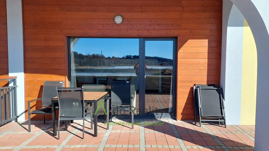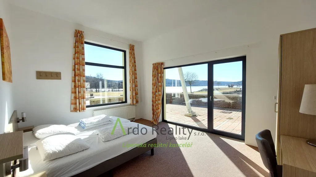 Apartmán s úžasnou terasou přímo u jezera v Lipně nad Vltavou na tom nejlepším místě disponuje především výhledem na Lipenské jezero, který se neomrzí. Terasa má 16 m2, obývací pokoj, z něhož je také krásný výhled na jezero Vás jistě také osloví svou rozlohou - 22,09 m2 a kuchyň s jídelnou 12,32 m2. Po čtyřech schodech se lehce dostanete do chodbičky, odkud je vstup do ostatních částí apartmánu. A to sice do ložnice, která má 17,76 m2, dále do koupelny a WC - 4,96 m2. V bytě je také technická místnost - 0,51 m2, ve které je nový plynový kotel Baxi Prime a zásobník na teplou vodu. Ve vedlejší podobné místnosti nalezneme mimo propriet potřebných na úklid také elektroměr, jističe a vodoměr - 0,27 m2. Do chodby samozřejmě vede hlavní vstup, jenž je označen číslem 123. Na fotografiích je vidět, že hned za rohem je vstup do místností se sklepy - sklep má rozlohu 2,05 m2. Apartmán je plně vybaven nábytkem, zařízením i vším ostatním.