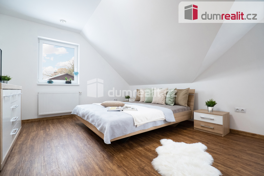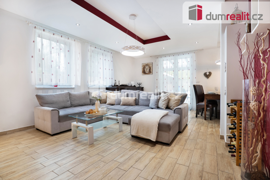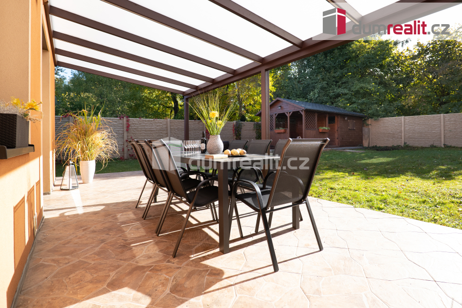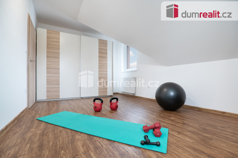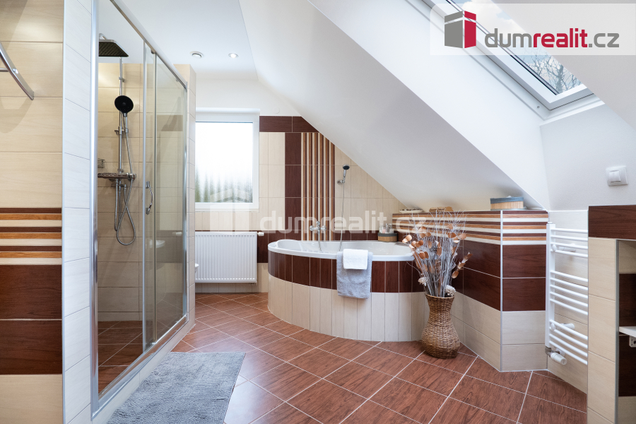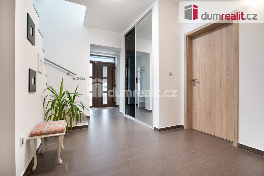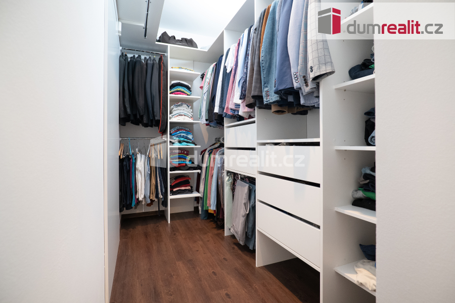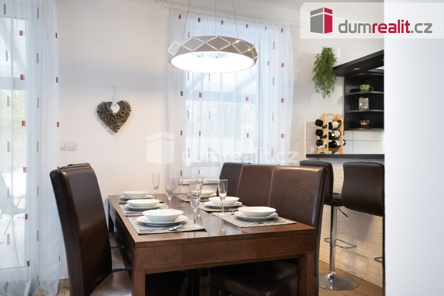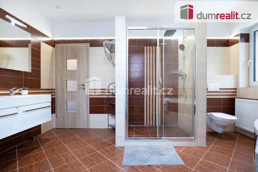 Interiér domu je navržen tak, aby splňoval všechny požadavky moderního bydlení. Dominantním prostorem je prostorný obývací pokoj s jídelnou, která je propojena s velkou kuchyní s barovým pultem. Tento otevřený prostor o velikosti více než 50 m² je ideální pro společné chvíle s rodinou i přáteli. Z obývacího pokoje je přímý vstup na zastřešenou terasu (28 m²), která nabízí skvělé místo pro relaxaci a venkovní posezení po celý rok. Příprava pro krb v obývacím pokoji je již hotová, což vám umožní snadno doplnit domov o útulnou atmosféru. V přízemí najdete také praktické zázemí, včetně vstupní haly s vestavnou šatní skříní, samostatné spíže, malé koupelny s toaletou a sprchovým koutem, pracovny a technické místnosti s přístupem do malého sklípku. Případně je zde možnost úpravy dispozice na 6+kk, což nabízí flexibilitu pro větší rodinu nebo specifické potřeby.