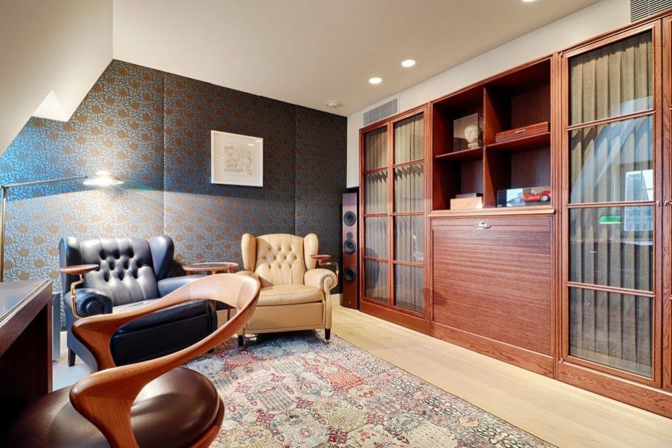 Interiér vyššího podlaží je tvořen obývacím pokojem, kuchyní, 2 ložnicemi, pracovnou, 2 koupelnami, samostatnou toaletou a halou. Nižší podlaží se skládá disponuje dvěma pracovnami, s terasou s letním posezením a neopakovatelnými, jedinečnými výhledy na Pražský hrad, en-suite koupelnou a šatnou, komory a galerie. Kupní cena zahrnuje veškeré luxusní vybavení. Privátní výtah přímo do bytu.