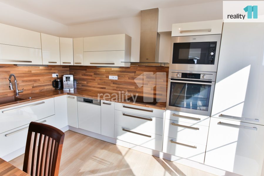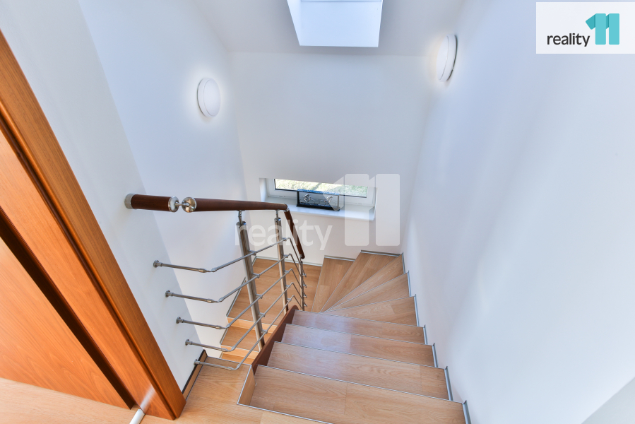 Praktický do posledního detailu. Při vstupu do domu oceníte prostorné zádveří (4,5 m²) a technickou místnost (5,4 m²). Chůzí po chodbě minete hostinský pokoj (12,3 m²) a spodní koupelnu (4,8 m²) a ocitnete se ve velkém světlém obývacím pokoji s kuchyní (60,5 m²). Pokoji dominuje designový krb na dřevo.