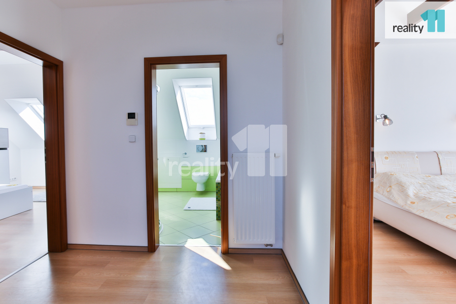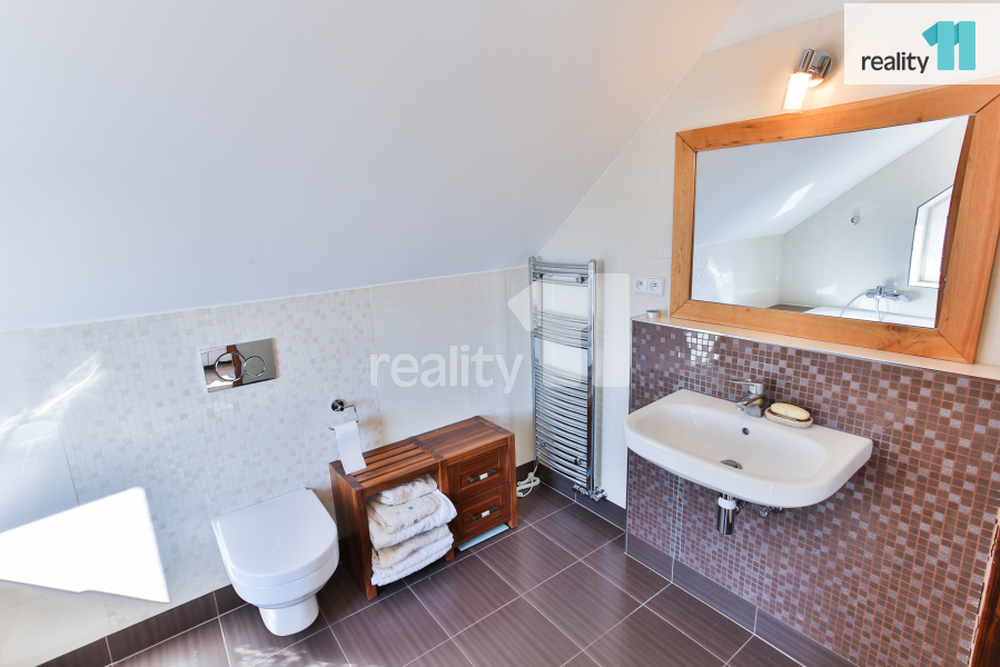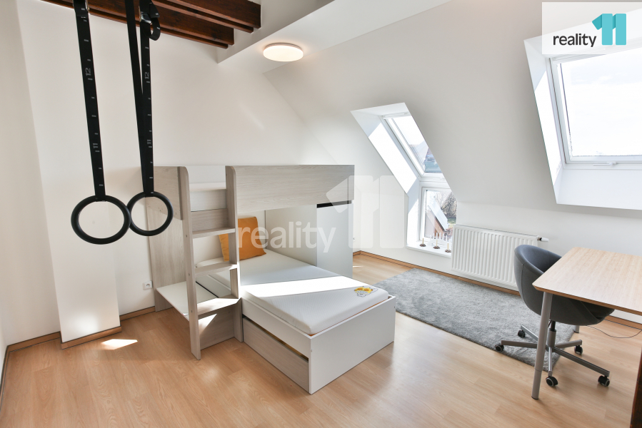 Po schodech se dostanete do druhého patra, kde se nachází další klenot, který ocení dospělí majitelé domu. Velká ložnice s šatnou (22,7 m²) a výhledem do lesa, k tomu náleží soukromá koupelna (7,2 m²). V patře leží také další koupelna (7,6 m²) a dva dětské pokoje (15,6 m² a 16,7 m²).