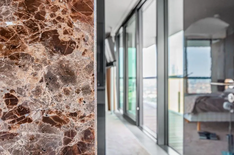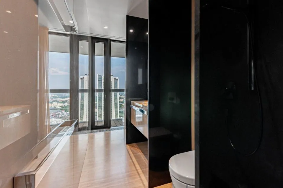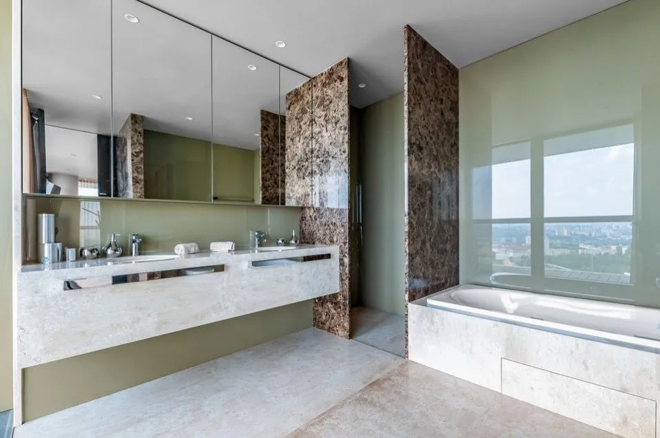 Dispozice bytu zahrnuje vstupní halu, velkorysý obývací prostor s přímým vstupem na terasu, samostatnou kuchyni v čistém bílém designu, dvě oddělené ložnice a hlavní ložnici. Dále jsou k dispozici dvě koupelny, přičemž hlavní koupelna disponuje vanou, sprchovým koutem, toaletou a bidetem, druhá koupelna je vybavena sprchovým koutem. Komfort doplňují další dvě samostatné toalety, dostatek úložných prostor a šatna zhotovená na míru. Terasa, která lemuje celý byt, je přístupná ze všech obytných místností i z koupelny a podtrhuje jedinečnost této nemovitosti.