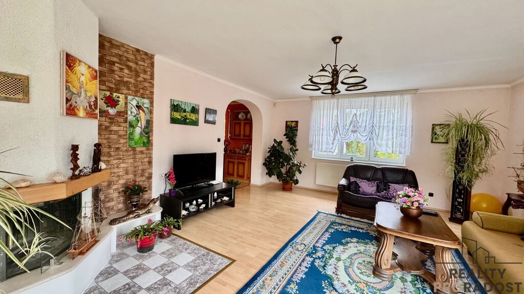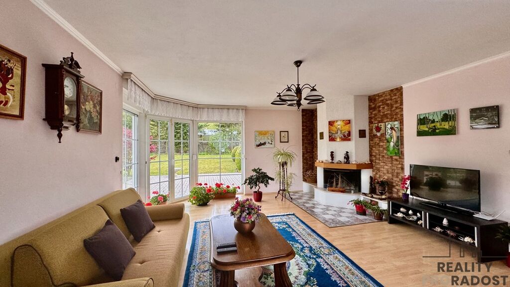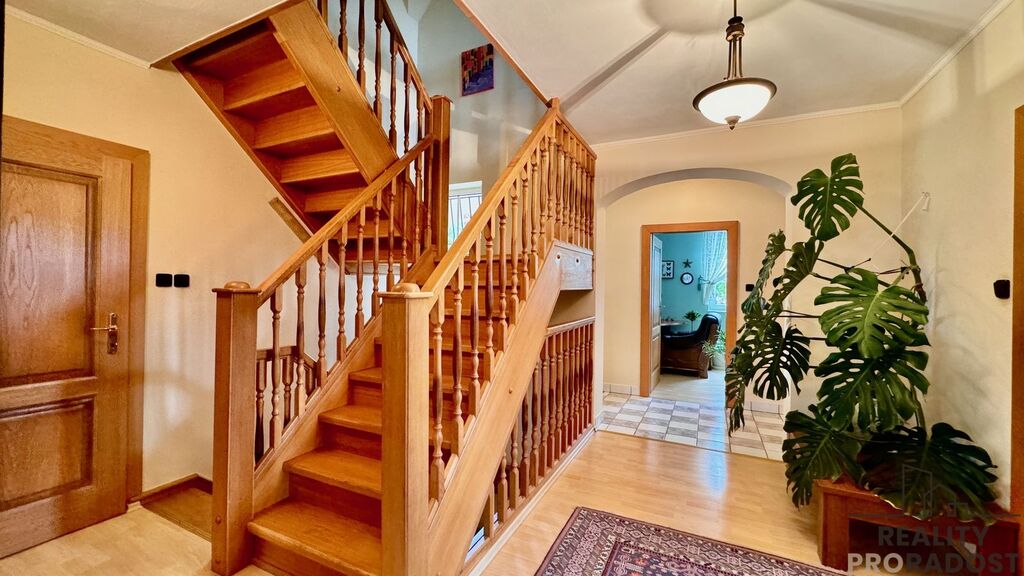Dispozice domu zahrnuje čtyři ložnice, dvě koupelny a dvě toalety. Prostorný obývací pokoj s krbem je propojen s plně vybavenou kuchyní. Součástí je také samostatná pracovna vhodná pro domácí kancelář. Nechybí technické a úložné prostory ani dva balkony. K dispozici je i velká uzavřená garáž. Dům je vybaven novým kondenzačním plynovým kotlem a bojlerem, centrálním vysavačem a venkovními žaluziemi.
