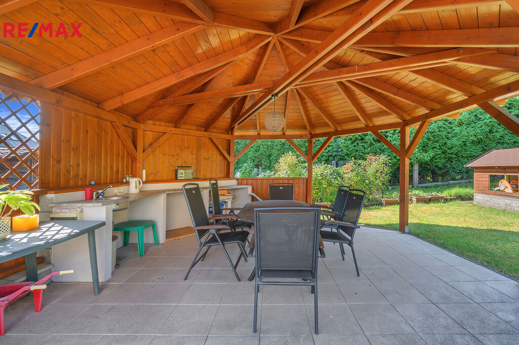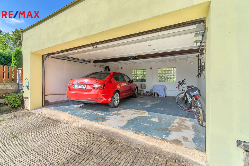 Na zahradě je k dispozici velká garáž, ze které se dá vybudovat další obytná místnost či dvě. Dále bazén, pergola a další malá stavba sloužící jako skládek.