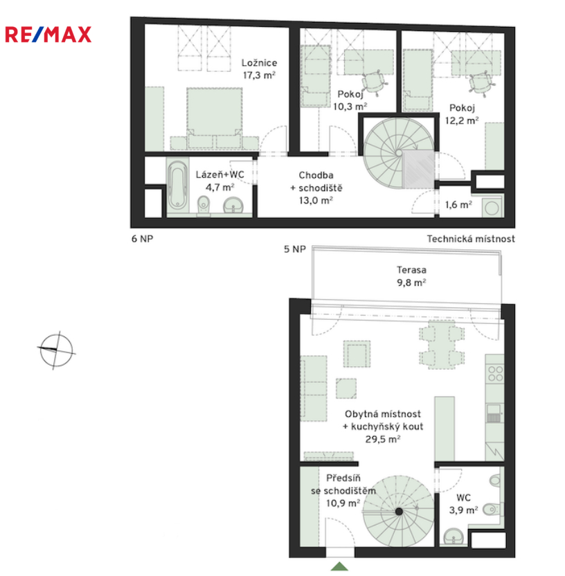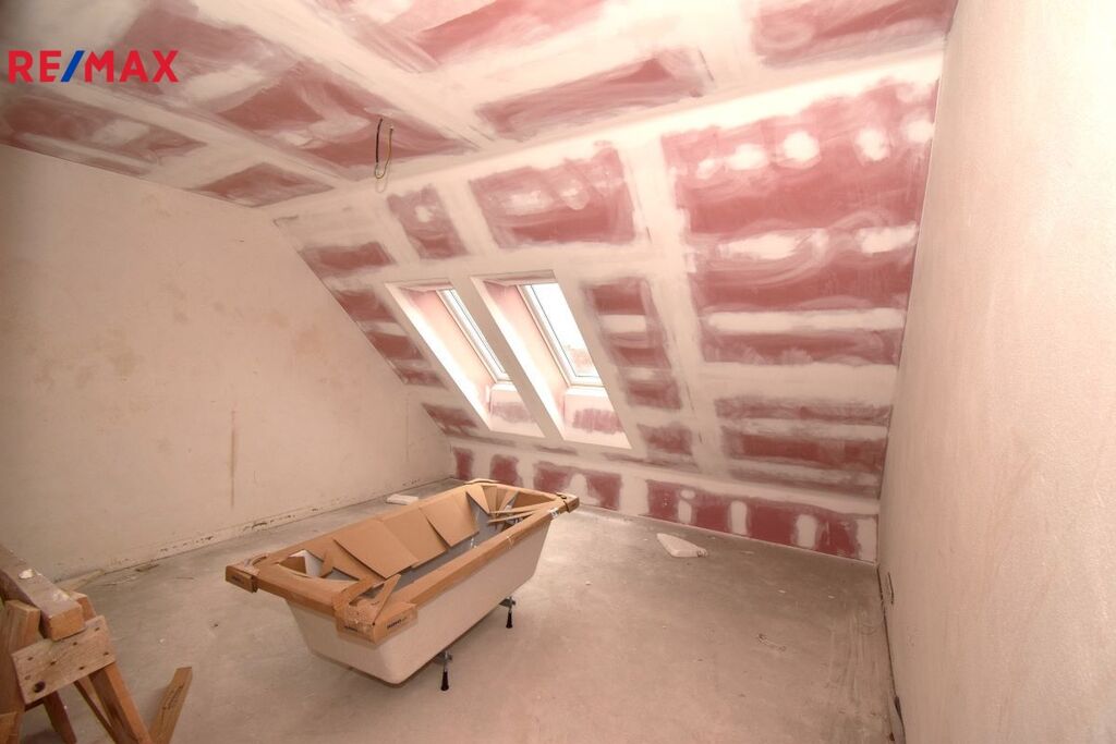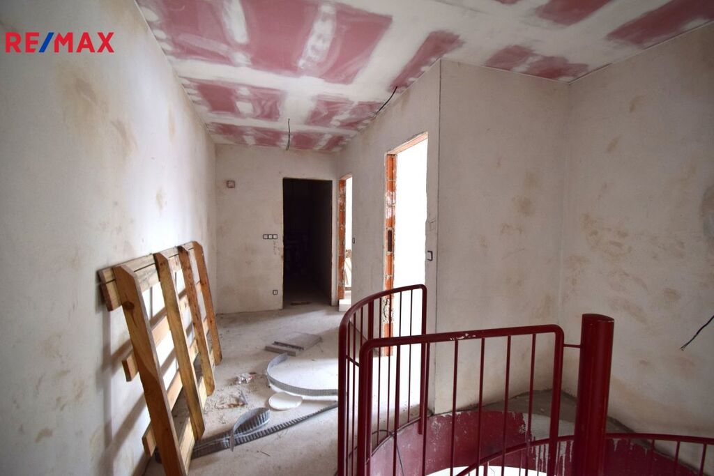 Po točitém schodišti se dostanete do horního patra bytu, kde je chodba, vstup do koupelny s vanou a WC, hlavní ložnice, dva samostatné pokoje a technická místnost.