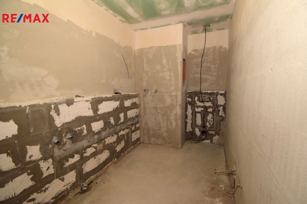 Za vchodovými dveřmi je předsíň se schodištěm, samostatné WC s umyvadlem a hlavní obývací prostor s přípravou na kuchyňskou linku. Z obývacího pokoje je vstup na terasu. Terasa má téměř 10m2.