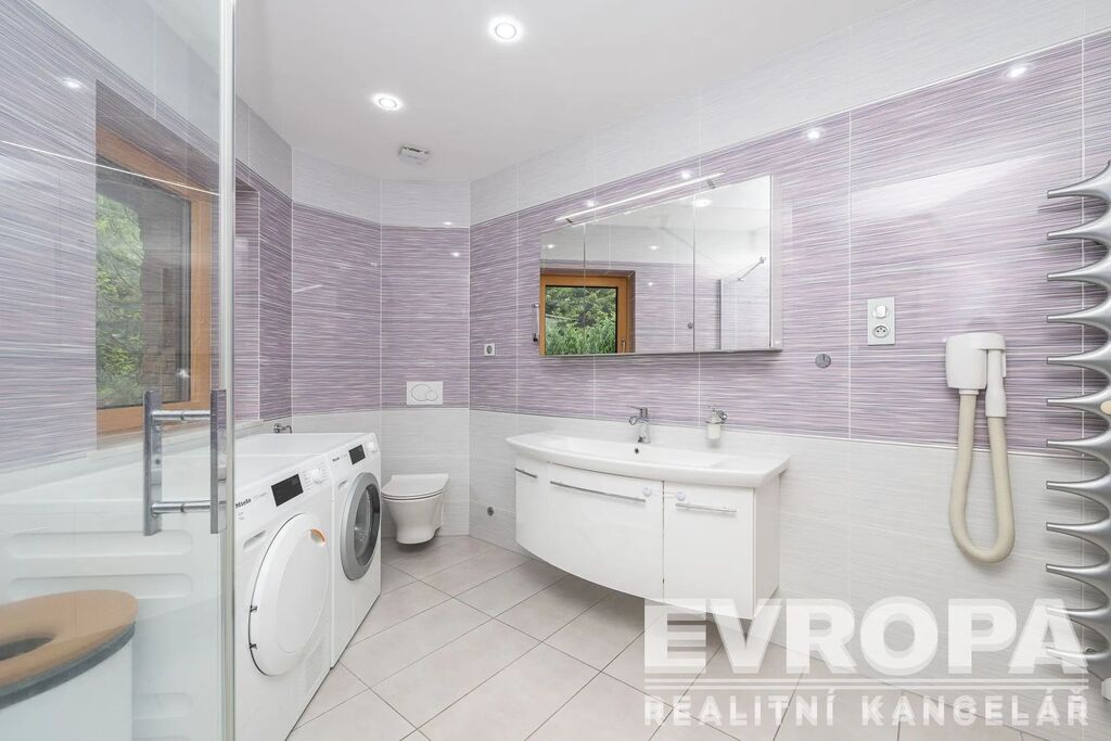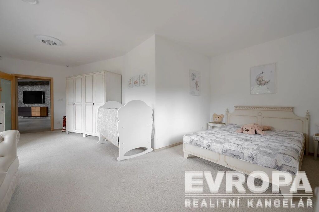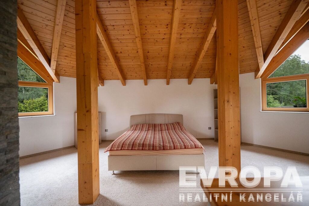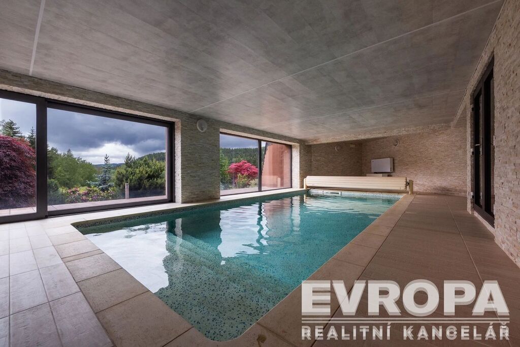 Otevřené patro galerie s ložnicí a vlastní koupelnou nabízí ničím nerušený výhled do okolní krajiny. Pro relaxaci je tu domácí wellness s bazénem 4x10 m, saunou s odpočívárnou a vířivkou výhledem do údolí, klubovna. Ať už hledáte únik před stresem každodenního života, nebo místo pro setkávání s přáteli, toto sídlo vám poskytne obojí.