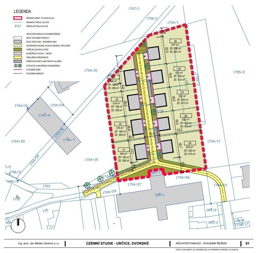 Pozemek je územním plánem vedený v plochách pro výstavbu rodinných domů - domy venkovského typu. Pozemek navazuje na stávající okrajovou zástavbu rodinných domů. Koeficient zastavění dle ÚP je maximálně 40%, plochy pro bydlení individuální, maximálně 1 nadzemní podlaží. Dopravní napojení ze stávající místní komunikace vedené k hranici pozemku. V současné době se na pozemku nachází zemědělská usedlost využívaná jako sklad, která se může využívat pro komerční nebo rezidenční účely, případně je možné budovu odstranit. Inženýrské sítě na hranici pozemku, elektřina zavedena. Obec Určice disponuje dobrou občanskou vybaveností, dobrou dostupností do města Prostějova (nachází se použe 6km jihozápadním směrem), v podhůří Drahanské vysočiny. Vzdálenost do Prostějova 6 km, nájezd na dálnici cca 4 km (nájezd Vranovice).