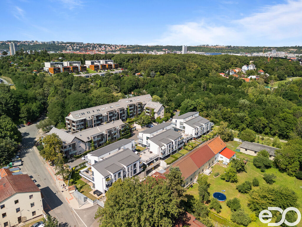 Díky velkým oknům působí byt velmi vzdušně a prostorně a zároveň máte výhled na celou zahradu, která patří k těm větším. Parkovací stání je umístěno v suterénu budovy a velkou výhodou je vlastní sklepní koje, které nebývá u novostaveb pravidlem.