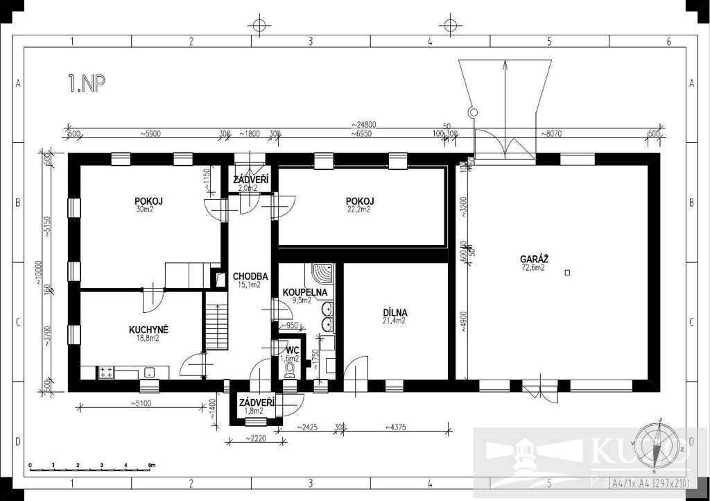 Přízemí - Obývací pokoj, Kuchyně, Ložnice, Koupelna, Toaleta, Chodba, Předsíň 2x