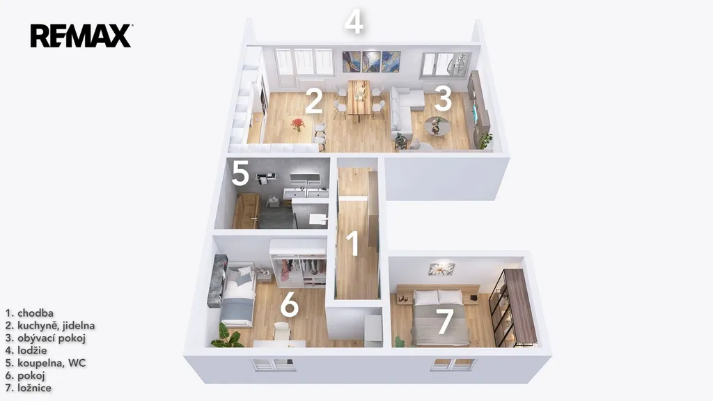 Byt je tvořen obývacím pokojem s jídelním a kuchyňským koutem vybaveným rohovou kuchyňskou linkou a ostrůvkem s velkým množstvím úložného prostoru, vestavěnou elektrickou troubou, mikrovlnou troubou, indukční varnou deskou, myčkou a vestavěnými skříněmi. Obývací pokoj je propojený s jídelnou a kuchyní v jednu velkou místnost, ze které vede vstup na prostornou terasu orientovanou na jihozápad, poskytuje prostor pro maximální rodinnou pohodu. Koupelna se sprchovým koutem a prostornou rohovou vanou, WC a žebříkovým radiátorem je dále vybavena dvěma umyvadly s vlastními skříňkami a velkým zrcadlem. Předsíň propojující všechny místnosti vede dále do dvou pokojů s okny orientovanými do zahrady směrem na severovýchod, tak aby byl dosažen maximální klid při regeneraci a spánku. Vytápění a ohřev vody je zajištěn plynovým kotlem umístěným v přízemí RD, který je společný pro oba byty.