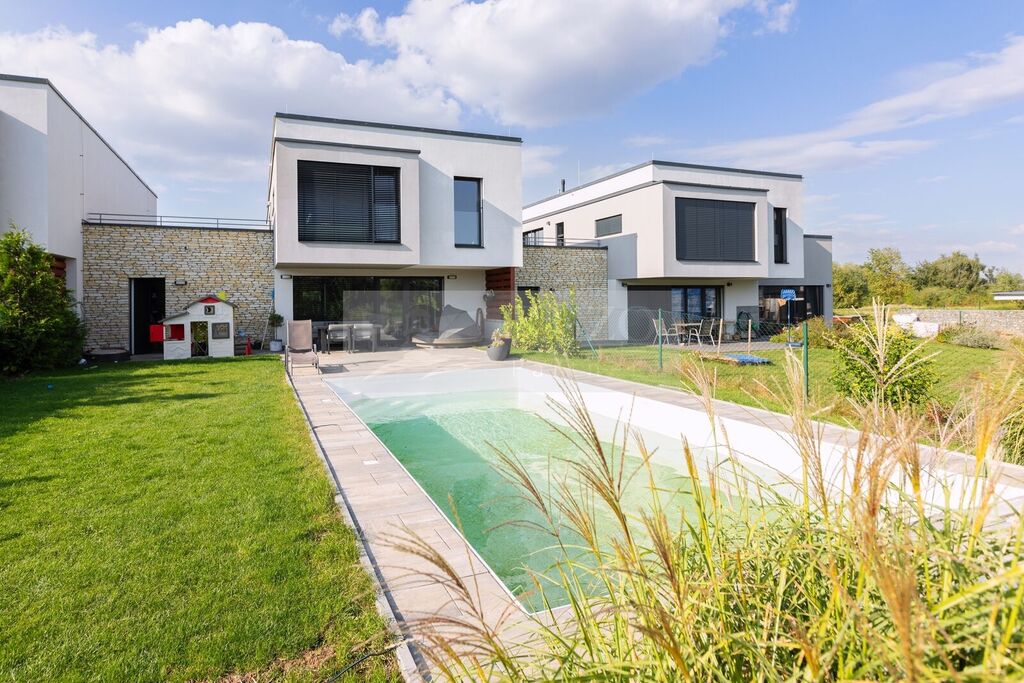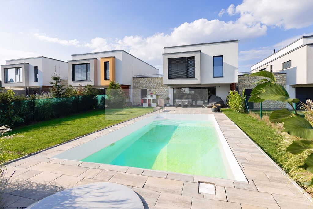 Zahrada a bazén - Vaše soukromá oáza: Soukromá zahrada je vaší oázou klidu, kde si můžete vychutnat sluneční paprsky, pěstovat vlastní bylinky nebo si jen tak odpočinout s knížkou v ruce. A co teprve osvěžující koupel ve vlastním bazénu (40 m2) během horkých letních dnů. Také Garáž propojená se zahradou zvyšuje komfort bydlení a navíc poskytuje bezpečné parkování pro vaše vozidlo.