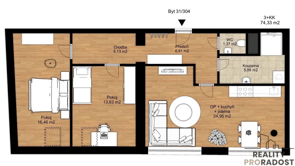 Prosvětlený 3+KK s orientací na západ. Užitná plocha 74,33 m2. 2 pokoje, samostatné WC, koupelna se sprchovým koutem. V chodbě dostatek prostoru na vestavěné skříně. Vytápění podlahovým topením, vlastní bojler na ohřev vody, klimatizace.