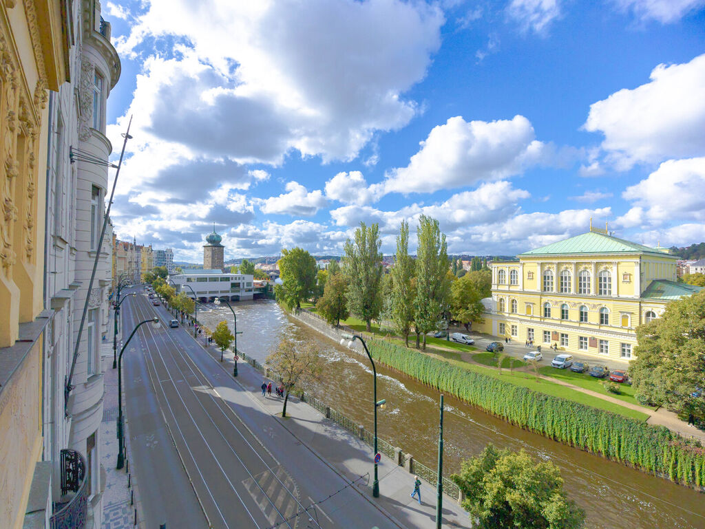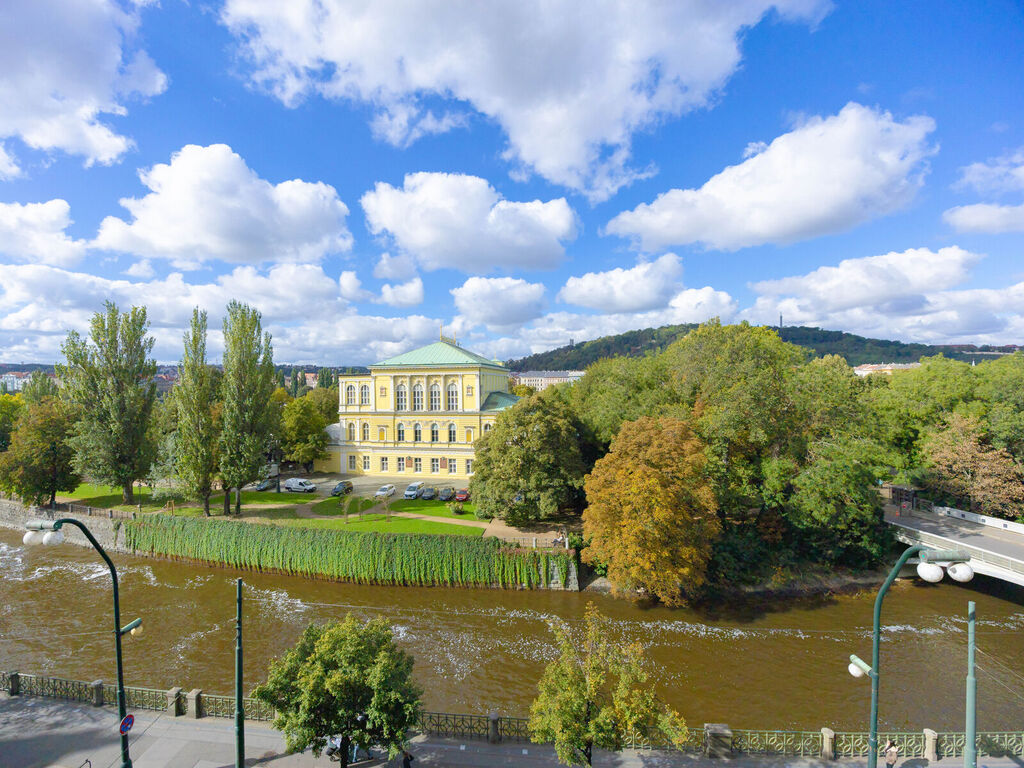 • Reprezentativní obývací pokoj (46,7 m²) s velkými okny nabízejícími dechberoucí výhledy na Pražský hrad, Národní divadlo, ostrov Žofín, výstavní síň Mánes a Tančící dům.