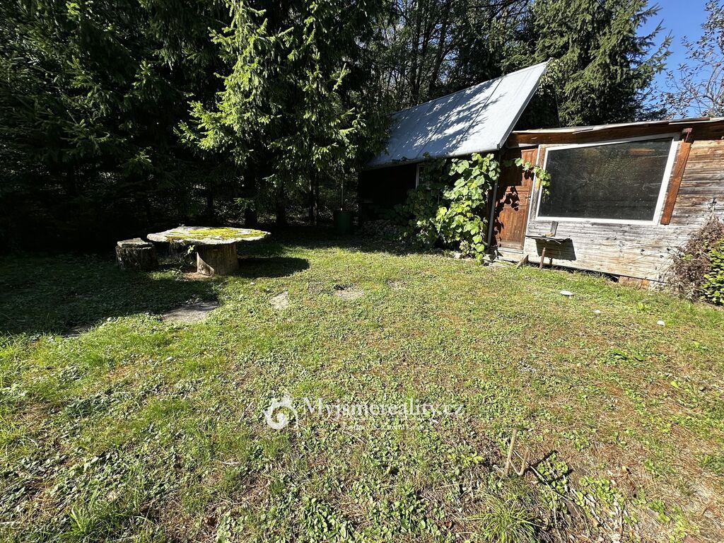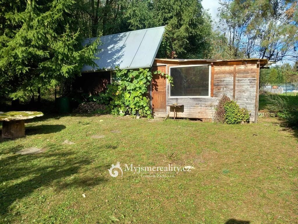 Na pozemku je zbudovaná dřevěná chata s verandou a další objekt,