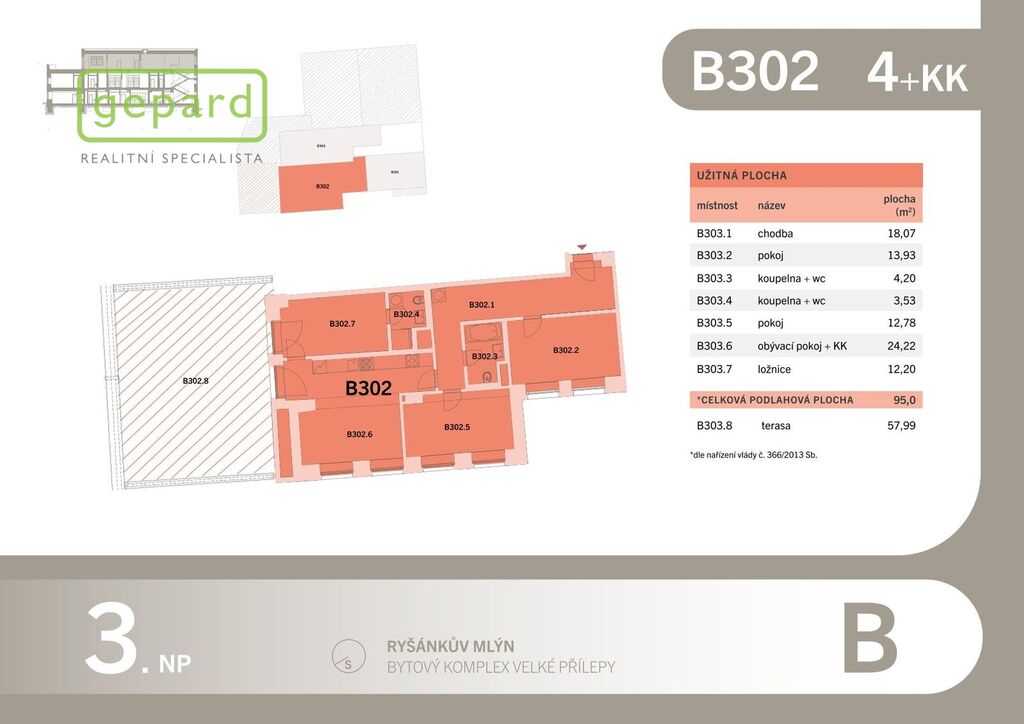 Realitní společnost Gepard nabízí k prodeji byt v OV 4+kk, 95m2 s terasou 58m2 (byt č. B302) v developerském projektu Ryšánkův mlýn ve Velkých Přílepech vzdálených od Prahy pouhých 6km a 15min autem.