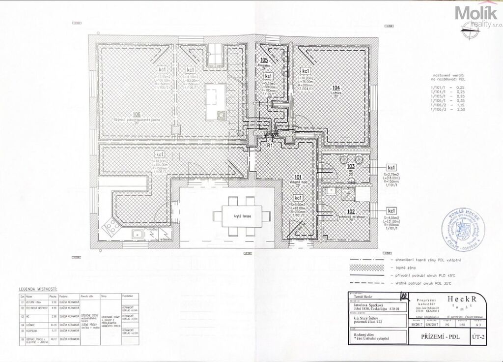 V dolní části obývací pokoj s kuchyní, pokoj pro hosty, ve kterém je i koupelna a toaleta, technická místnost.