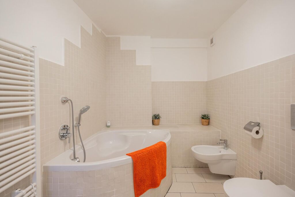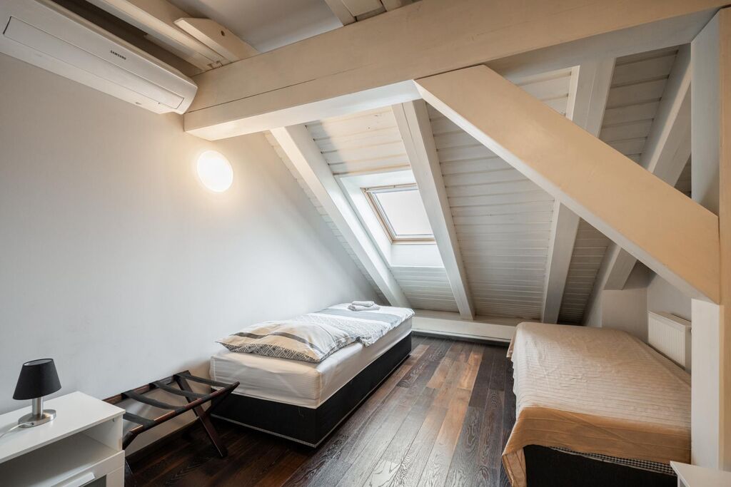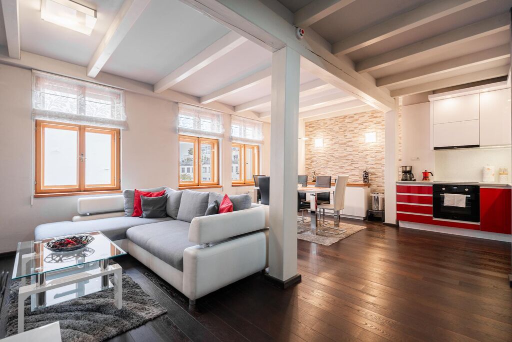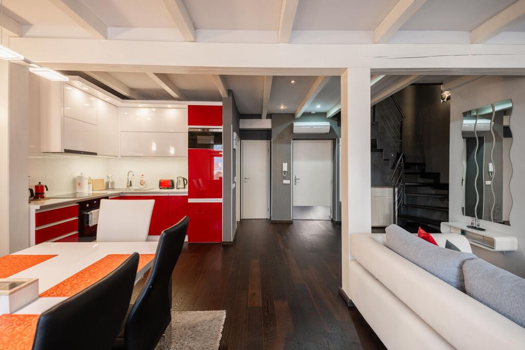 Dominantou bytu je otevřený obývací pokoj s jídelním koutem a s kuchyní s vestavnými spotřebiči. Z obývacího pokoje je vstup do ložnic po schodech v patře. Ložnice jsou oddělené a poskytují tedy soukromí. Byt poskytuje prakticky dvě koupelny. Světlá prostorná koupelna se sprchovým koutem je umístěna v dolní části bytu, s umyvadlem a wc. Druhou toaletu nalezneme i ve druhé koupelně, kde se nachází vana i bidet.