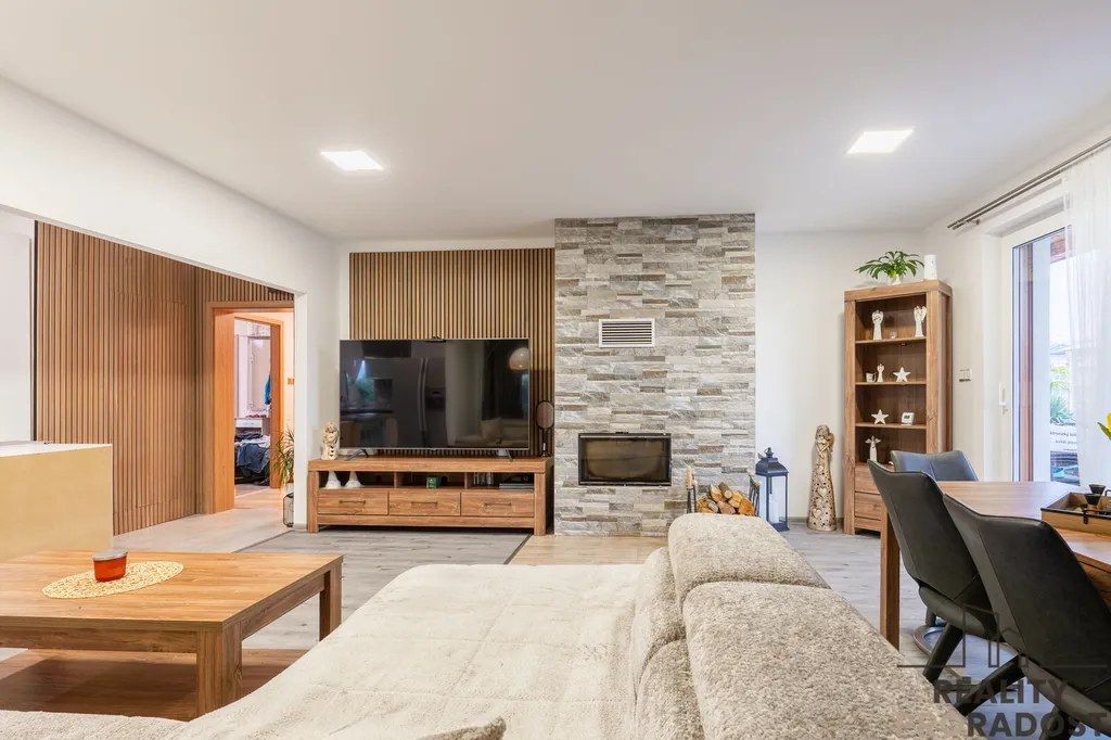 Prostorný a světlý obývací pokoj s přímým vstupem na terasu a do zahrady, ideální pro rodinné setkávání a relaxaci.