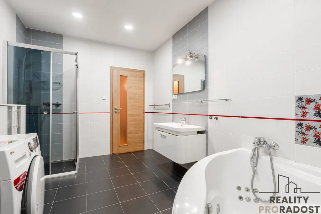 Stylová koupelna s rohovou vanou i sprchovým koutem, kde si můžete dopřát zasloužený odpočinek.