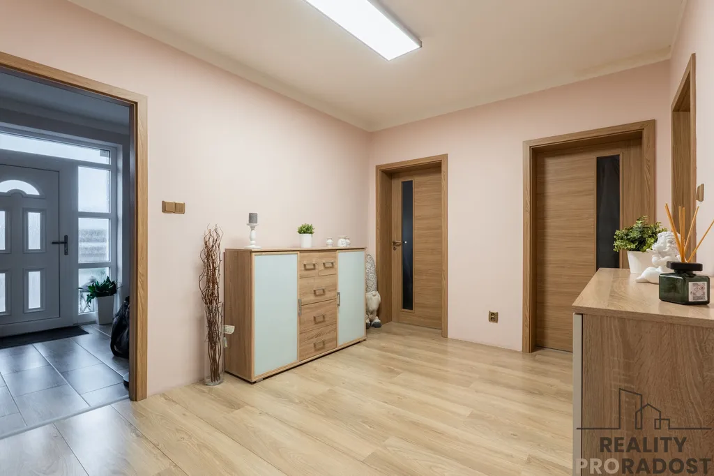 Centrální hala s vchody do všech místností, samostatná spíž, samostatná šatna a samostatná technická místnost pro čistý, klidný, tichý a esteticky uspořádaný provoz domácnosti.