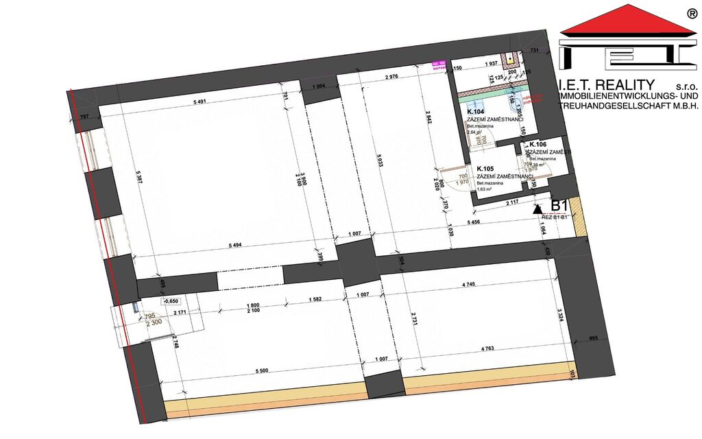 1x místnost o výměře 27,72 m², 1x místnost 18,07 m², 1x místnost 21,07 m², 1x místnost (sklad) 13,37 m ², toaleta 2,64 m², kuchyňka + zázemí 3 m²