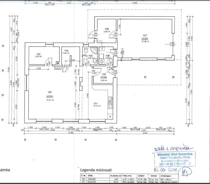 1. NP: předsíň, velký obývací pokoj s kuchyňským koutem a vstupy na terasu, menší pokoj, technická místnost, koupelna, toaleta .