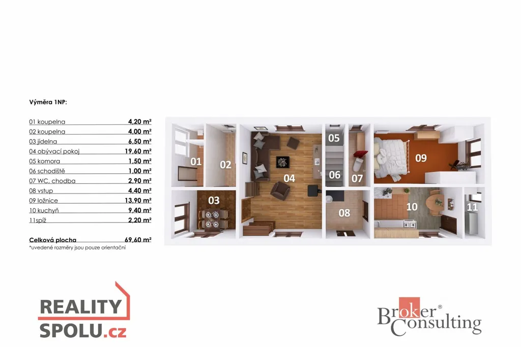 Dům s celkovou užitnou plochou 117 m² nabízí útulný domov pro rodinu, nebo může sloužit i nadále jako zavedený turistický penzion. Jsou zde čtyři pokoje a dvě koupelny, což zajišťuje komfortní bydlení pro více členů domácnosti. V 2. NP je pokoj s výstupem na slunnou venkovní terasu, ideální místo pro relaxaci při západu slunce.