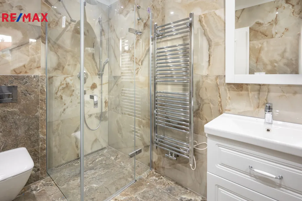 Z obývacího prostoru i ložnice vedou francouzská okna přímo na terasu. Představte si, jak si užíváte ranní kávu na terase nebo večerní relaxaci s výhledem na zeleň – to vše v naprostém soukromí. Na tomto patře je k dispozice pokoj pro hosty a také koupelna s WC.