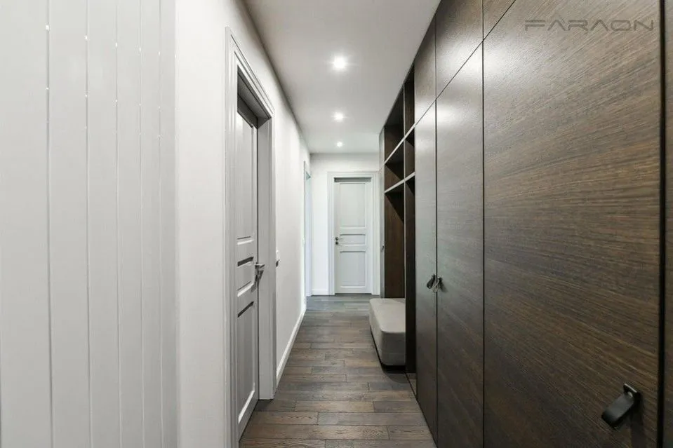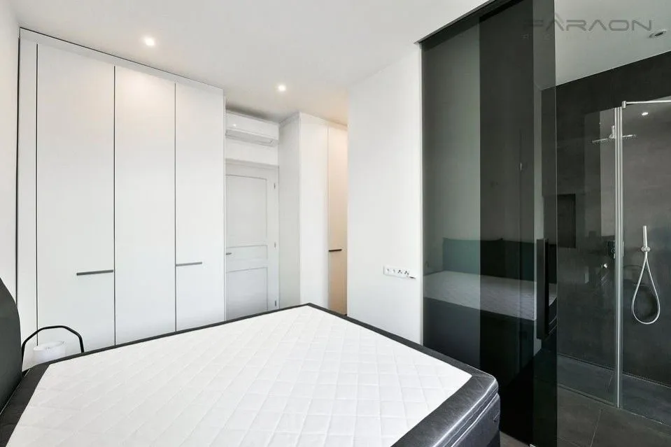 Interiér bytu tvoří otevřený prostor obývacího pokoje s plně vybavenou kuchyní a jídelním prostorem, hlavní ložnice s koupelnou s vanou, druhá ložnice s koupelnou se sprchovým koutem, vanou, toaletou, bidetem, vstupní chodba.