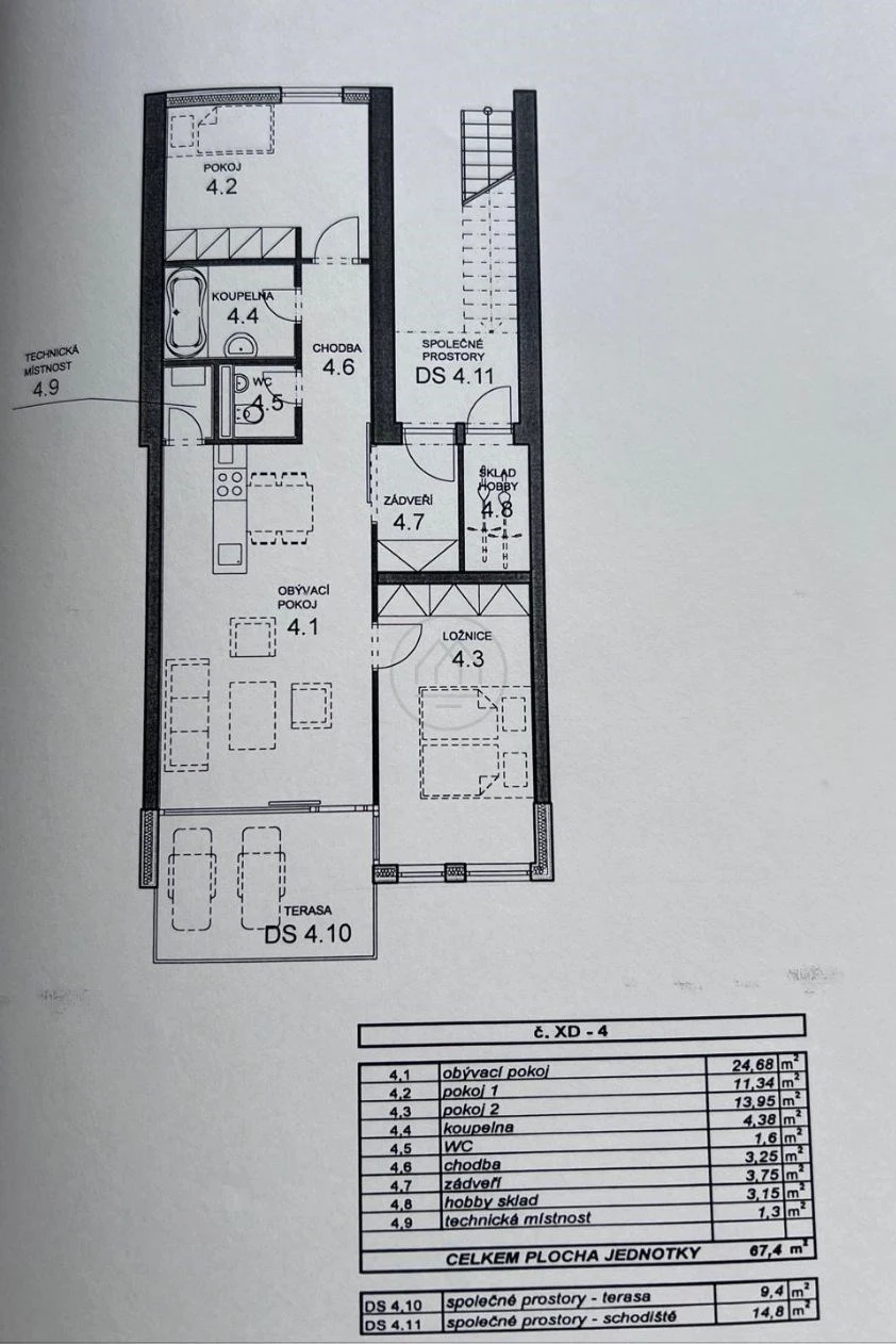 Apartmán zahrnuje zádveří, dvě ložnice, koupelnu, oddělené WC a prostorný obývací pokoj s kuchyní. Z této hlavní obytné části je přímý vstup na velkou terasu o výměře 9,4 m², která nabízí klidný výhled do zeleně a vnitrobloku.