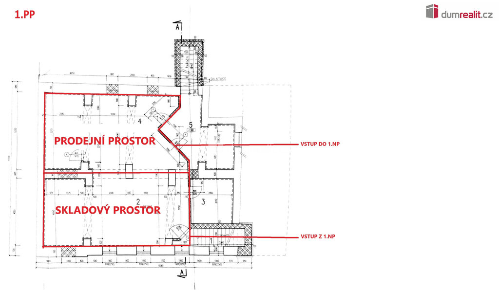 - 1.NP prostor cca 150 m² - prodejna s hlavním vstupem a výlohami