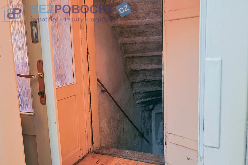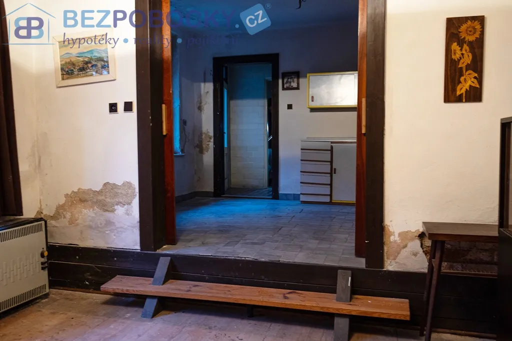 V přední části domu je průjezd, který může po úpravě sloužit jako parkovací místo. Odtud je vstup do prvního bytu 2 + 1 s koupelnou a s WC. Z průjezdu je také schodiště na půdu kde lze vybudovat obytné podkroví.