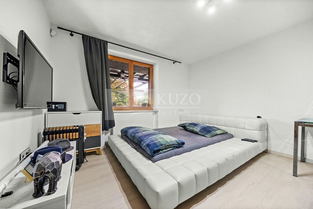 V přízemí se nachází pracovna se sociálním zařízením a bytová jednotka 1+1 rovněž se sociálním zařízením. Je zde také vstup do prádelny, kotelny, botárny a garáže. V 1. patře je nově zrekonstruovaná kuchyně s moderními spotřebiči (horkovzdušná trouba, mikrovlnná trouba, nadstandardně velká indučkní varná deska 52 x 78 cm, myčka nádobí, americká lednice), útulná jídelna, velká koupelna, prostorný obývací pokoj a pohodlná ložnice s balkónem a výhledem na zahradu, menší pokoj, sociální zařízení a spíž.