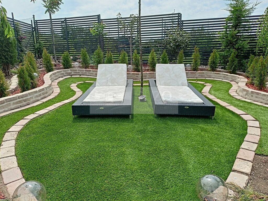 Zahrada tohoto domu je skutečnou oázou klidu. Najdete zde nejen pergolu z dubového dřeva, ale také dvě relaxační zóny. Dále je zde okrasné jezírko s rybkami, které dotváří atmosféru klidu, a vířivka pro relaxaci. Celý prostor zahrady (realizované v souladu s Feng Shui) je ideální pro rodinné oslavy, grilování s přáteli nebo jednoduše pro chvíle odpočinku. Celý pozemek je oplocen a osázen živým plotem ze stálezelených bobkovišní.