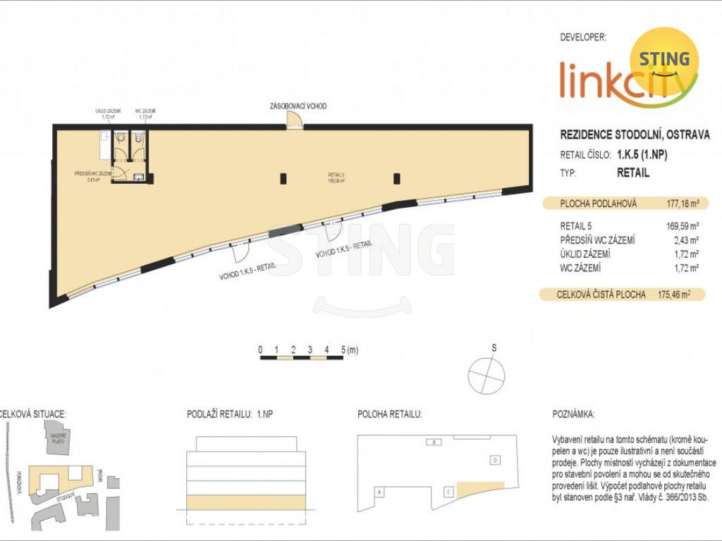 V exkluzivním zastoupení developerské skupiny Linkcity Czech Republic a.s. Vám nabízíme ke koupi budoucí obchodní jednotku v Projektu REZIDENCE STODOLNÍ. Tento velmi atraktivní projekt s polohou v centru města a budoucí pěší zónou nabízí klientům příležitost koupit si vlastní, přízemní obchodní jednotku o velikosti 177 m2, s originální a atraktivní dispozicí .