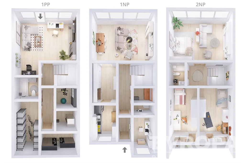 V přízemí domu se nachází skladové a technické místnosti, toaleta a obývací pokoj se vstupem na zahradu. V prvním podlaží domu se nachází šatní místnost, toaleta komora, kuchyň a obývací pokoj. Ve druhém podlaží domu se nachází 2 ložnice se vstupem na balkon, hlavní ložnice s výhledem do zahrady a toaleta.