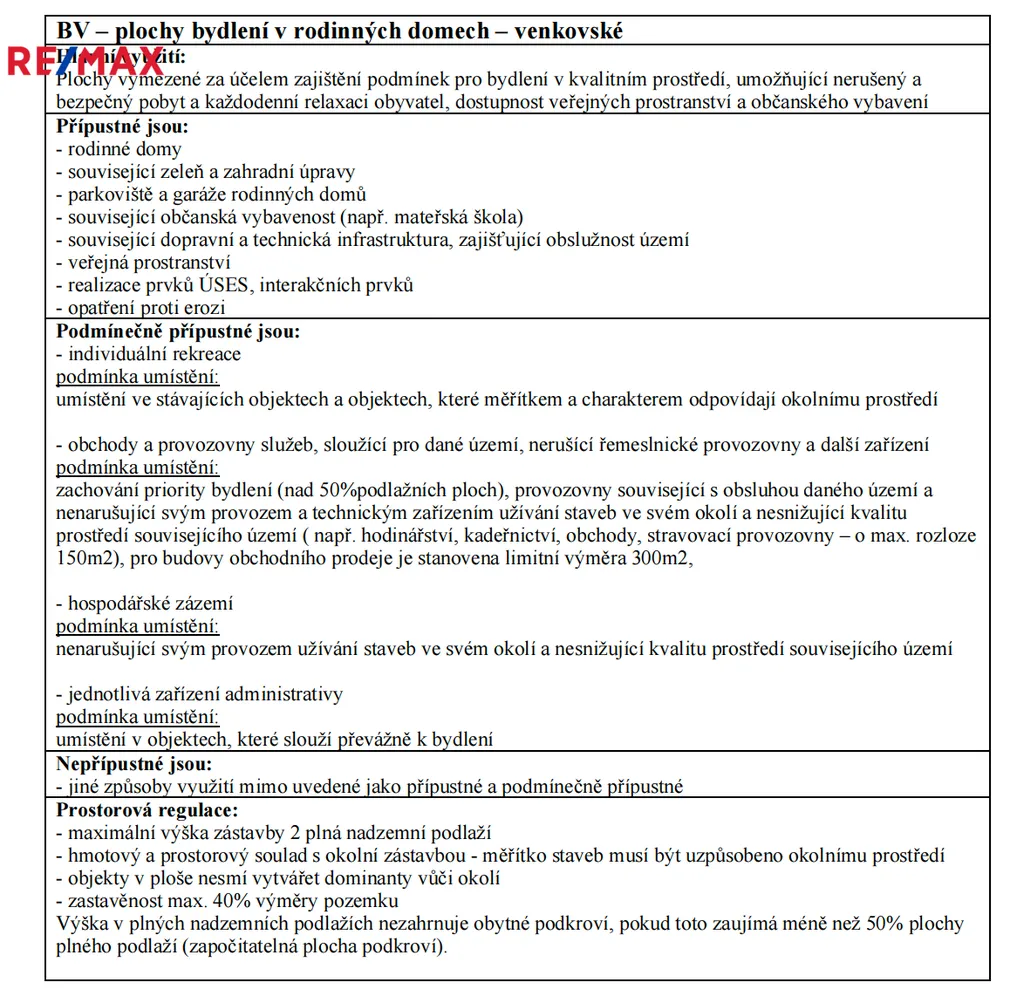 Pozemek je dle územního plánu určený pro "bydlení v rodinných domech - venkovské", tedy plochy vymezené za účelem zajištění podmínek pro bydlení v kvalitním prostředí, umožňující nerušený a bezpečný pobyt a každodenní relaxaci obyvatel, dostupnost veřejných prostranství a občanského vybavení.