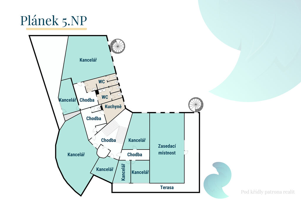 Nabízíme Vám 7 kanceláří ve 5.NP o rozloze 378 m2. Na patře je také společná kuchyňka a toalety. K využití dvě terasy o výměře 20 m2 a 63 m2.