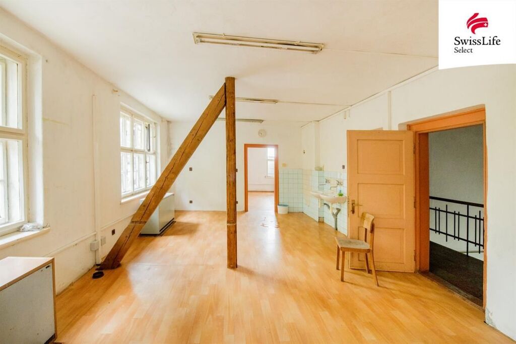 1. patro: 4 kanceláře (možnost přestavby na byty nebo zázemí pro zaměstnance), půdní prostor