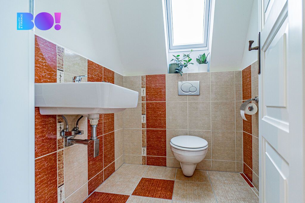 Dispoziční řešení prvního podlaží (104,26 m²): vstupní hala, samostatné wc, kouzelný otevřený prostor, kde se snoubí elegantní kuchyně s ostrůvkem, útulná jídelna a prostorný obývací pokoj s krbem – ideální místo pro společné chvíle s rodinou i přáteli. Ke komfortu přispívají dva světlé pokoje s koupelnou a odděleným WC. Tady se budete cítit opravdu jako doma!