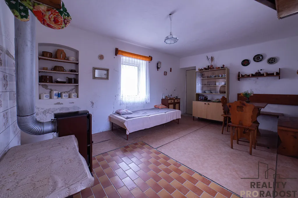 Dispozice domu tvoří vstupní předsíň se schodištěm do podkroví, ze kterého lze vytvořit další 2 pokoje. Vstup do koupelny s toaletou a samostatné vstupy do ložnice a kuchyně s jídelnou. Z kuchyně je další vstup do dílny, ze které vedou dveře za dům, kde se nachází malý pozemek pro posezení, relax. Nutno dodat, že za domem protéká potůček, který oceníte v letních měsících.
