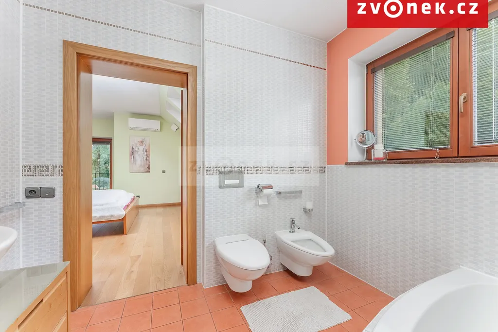 Unikátní dominantou nemovitosti je wellness v suterénu s vlastní terasou: vnitřní vyhřívaný bazén se slanou vodou, sauna, posilovna, prosklená sprcha, WC a prosklený krb, který vyhřívá bazén i okolní prostory. Z bazénové části i z velké venkovní terasy je přímý vstup do udržované zahrady s krásnými výhledy. V domě je osobní výtah vedený od wellness přes obytnou část až do prostoru ložnic.
