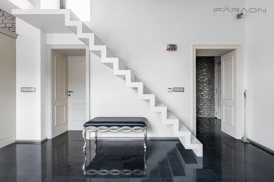 Dispozici bytu tvoří zádveří se samostatnou toaletou, mimořádně prostorný světlý obývacího pokoj s plně vybavenou kuchyní, jídelnou a relaxační zónou s posezením a balkonem orientovaným do klidného vnitrobloku, hlavní ložnice s koupelnou a pracovna. Z obývacího pokoje se dostanete pomocí designového schodiště na střešní terasu poskytující absolutní soukromí.
