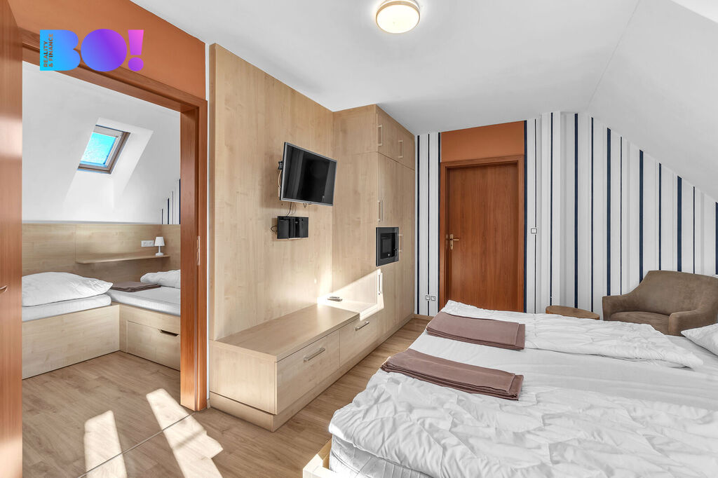 Dispozice 1.NP - vstupní hala, společenská místnost s centrální kuchyní se vstupy na zahradu, pergolu s grilem a dětským koutkem, 1x apartmán, 2x sklad, lyžárna, garáž - dílna s možností vybudování dalšího pokoje, ev. wellness nebo malé konferenční místnosti. 2.NP - 4x pokoj, vstup na půdu.