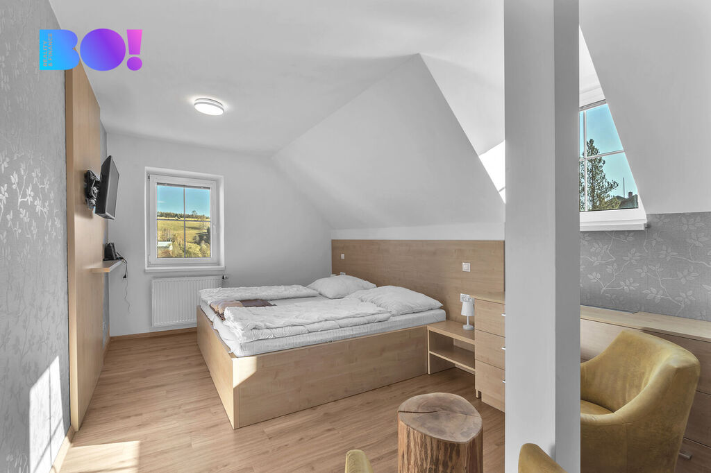Dispozice 1.NP - vstupní hala, společenská místnost s centrální kuchyní se vstupy na zahradu, pergolu s grilem a dětským koutkem, 1x apartmán, 2x sklad, lyžárna, garáž - dílna s možností vybudování dalšího pokoje, ev. wellness nebo malé konferenční místnosti. 2.NP - 4x pokoj, vstup na půdu.