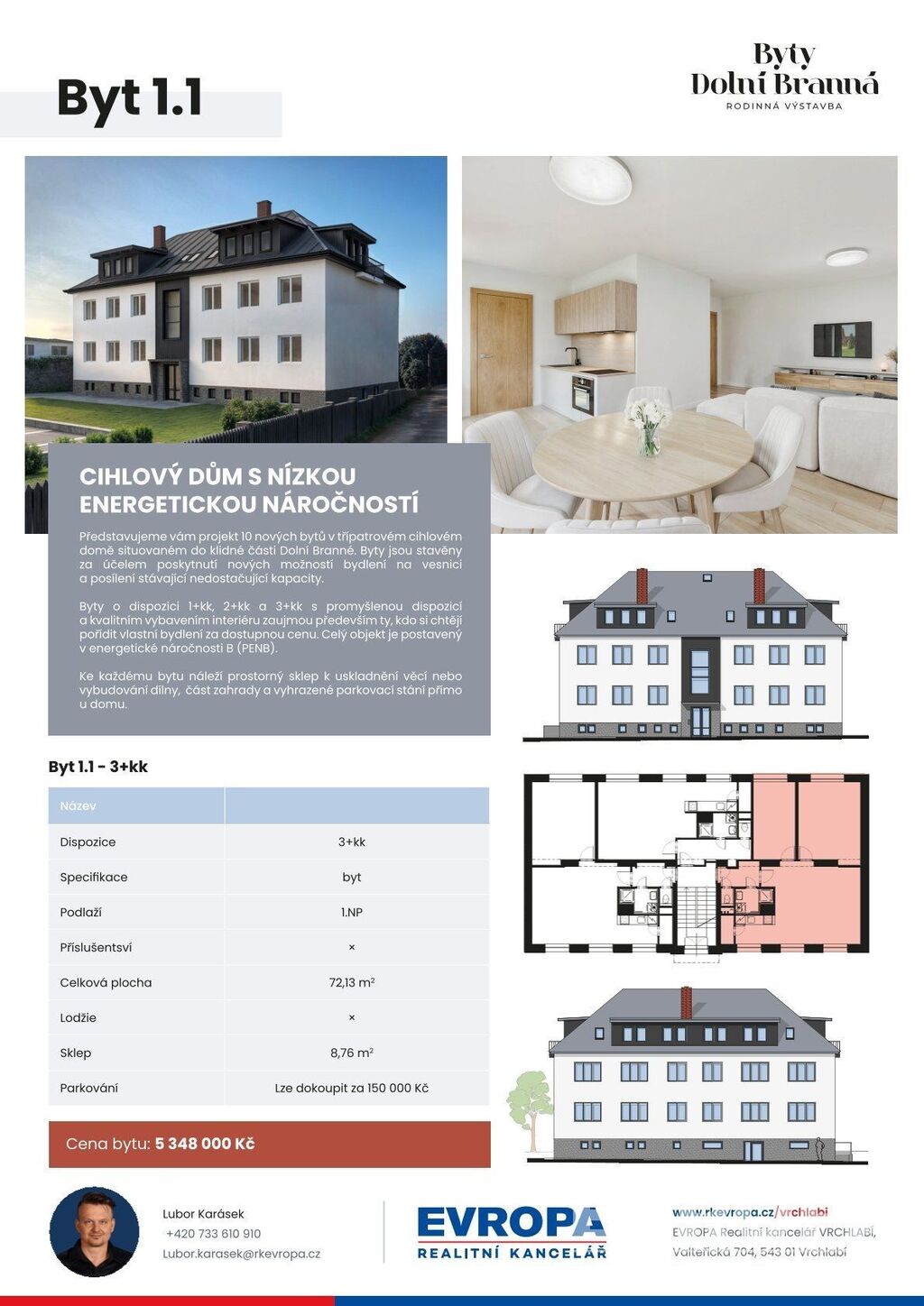 (K bytu si lze vybrat sklep. Parkovací stání lze koupit za 150 000, Kč)