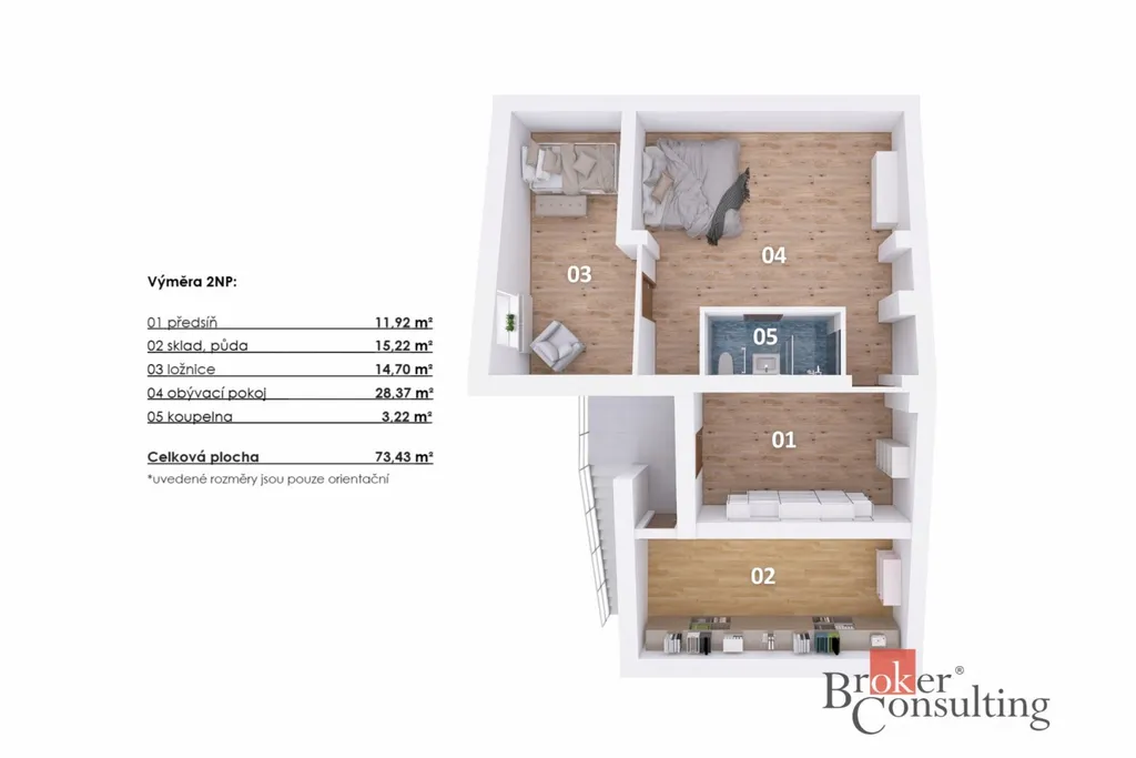 - Byt 2+KK (73 m², 2. NP) – útulný prostor s velkými úložnými prostory.
